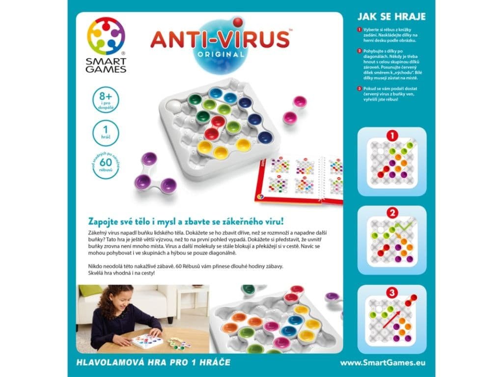 Kompaktní rozměry balení (24,5 × 24,5 × 4,7 cm) umožňují vzít si hru kamkoli s sebou. Je to skvělá volba pro všechny, kteří si chtějí procvičit mozek zábavnou formou a zároveň se něco nového naučit.Hra je vhodná pro děti od 8 let i dospělé, kteří mají rádi logické výzvy. Kvalitní zpracování a promyšlený design zaručují, že vás hra bude bavit po dlouhou dobu. Je to také vynikající dárek pro každého, kdo má rád hlavolamy nebo chce rozšířit svou sbírku chytrých her.V balení najdete pevnou herní desku, která představuje vnitřek buňky, jedenáct herních dílků představujících různé molekuly, červený virus, který musíte dostat ven, a knížku s 60 zadáními a jejich řešeními. Hra pochází od renomovaného českého vydavatele Mindok, který je známý svými kvalitními a promyšlenými deskovými hrami.Pokud hledáte chytrou zábavu, která rozvíjí myšlení a přináší radost z řešení netradičních úkolů, je SMART - AntiVirus tou správnou volbou. Staňte se hrdinou mikrosvěta a zachraňte buňku před virem!