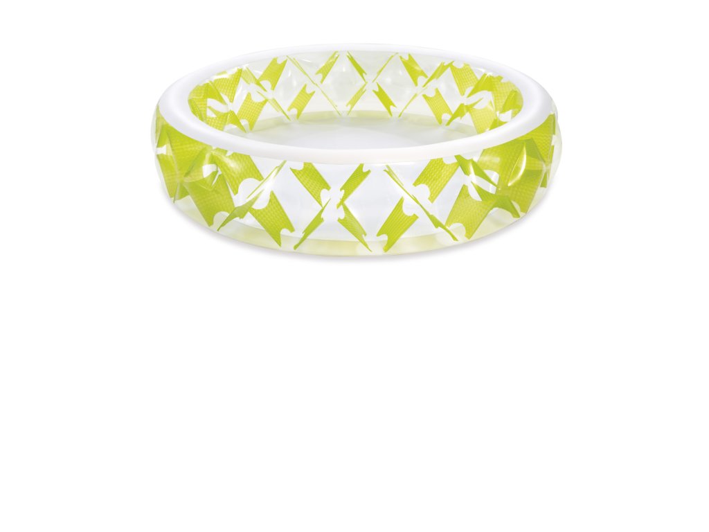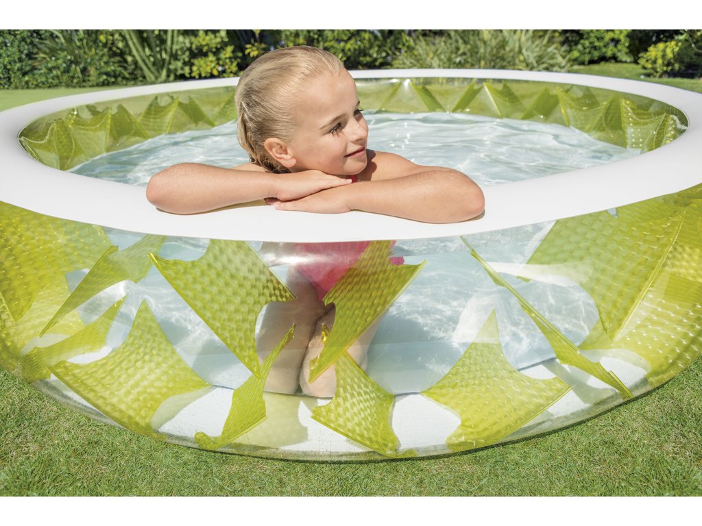 Kruhový nafukovací bazén pro osvěžení v horkých letních dnech. Průměr bazénu je 2,29 metru, hloubka 56 cm