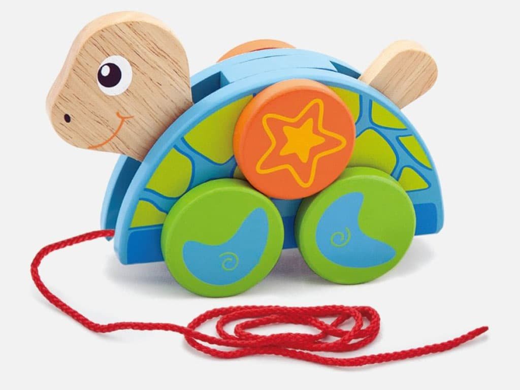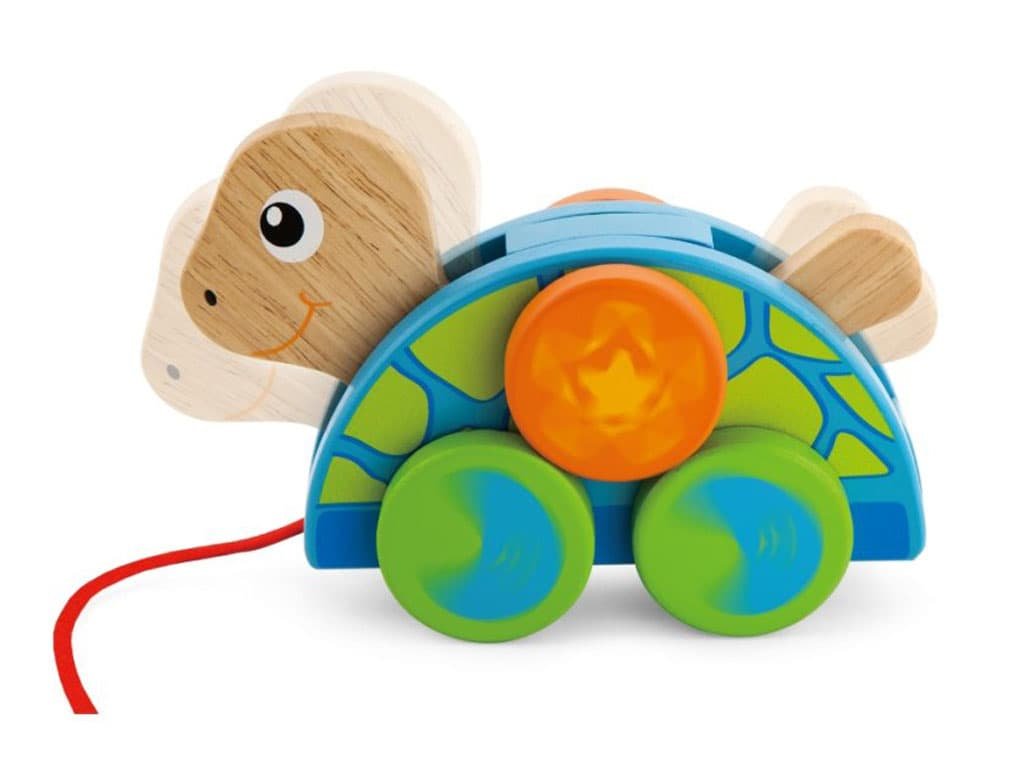 Veselá želva na kolečkách přirozeně motivuje děti k pohybu a podporuje jejich první samostatné krůčky. Při tahání za provázek si vaše dítě zdokonaluje koordinaci pohybů, rovnováhu a získává sebedůvěru při chůzi.Pohyblivé prvky na krunýři želvy navíc stimulují jemnou motoriku a zvídavost.