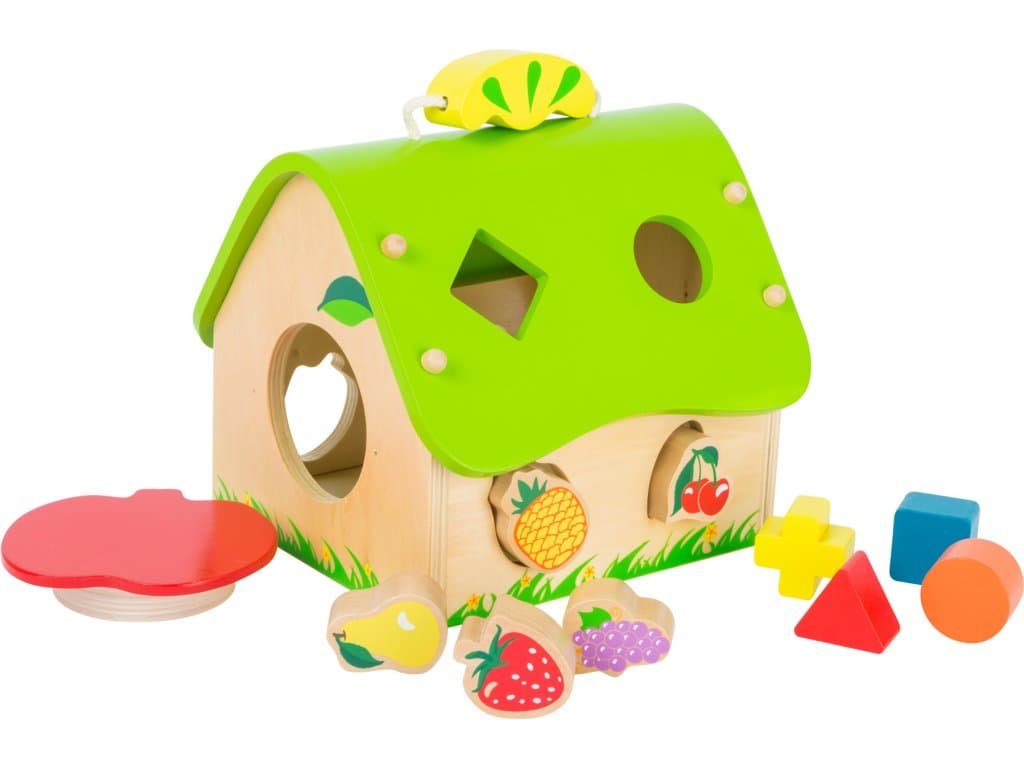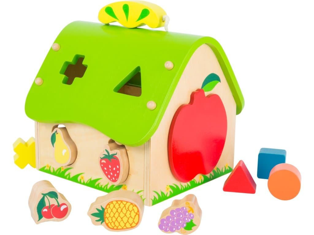 Obsah balení: dřevěný domeček s otvory + sada vkládacích tvarů a "ovoce"
