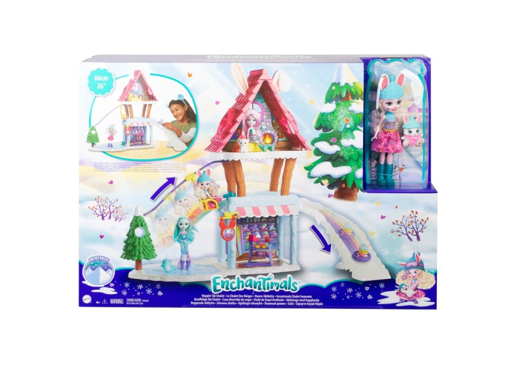 Enchantimals™ vyráží na hory! Každou holčičku určitě potěší tato velká sada, v které najde čekají 4 herní plochy, 11 parádních doplňků, sedačkovou lanovku a ledovou skluzavku. Pojď se vydat na průzkum, co vše se v horské chatce ukrývá. Pořiď si všechny nezbytnosti v lyžařském obchůdku, zajdi si zabruslit na kluziště nebo si odpočiň v útulném salónku. Bevy Zajíčková a králíček Chalet™ se již nemohou dočkat, až si společně užijete nejrůznější zimní aktivity. Vyvez králíčka Chalet™ lanovkou a poté jej pošli na sáňkách dolů po sjezdovce. Nebo si užijte spoustu zábavy na ledové skluzavce. Parádní doplňky jako brusle, lyžařské brýle, sedací pytle a další zaručují spoustu zimní zábavy!