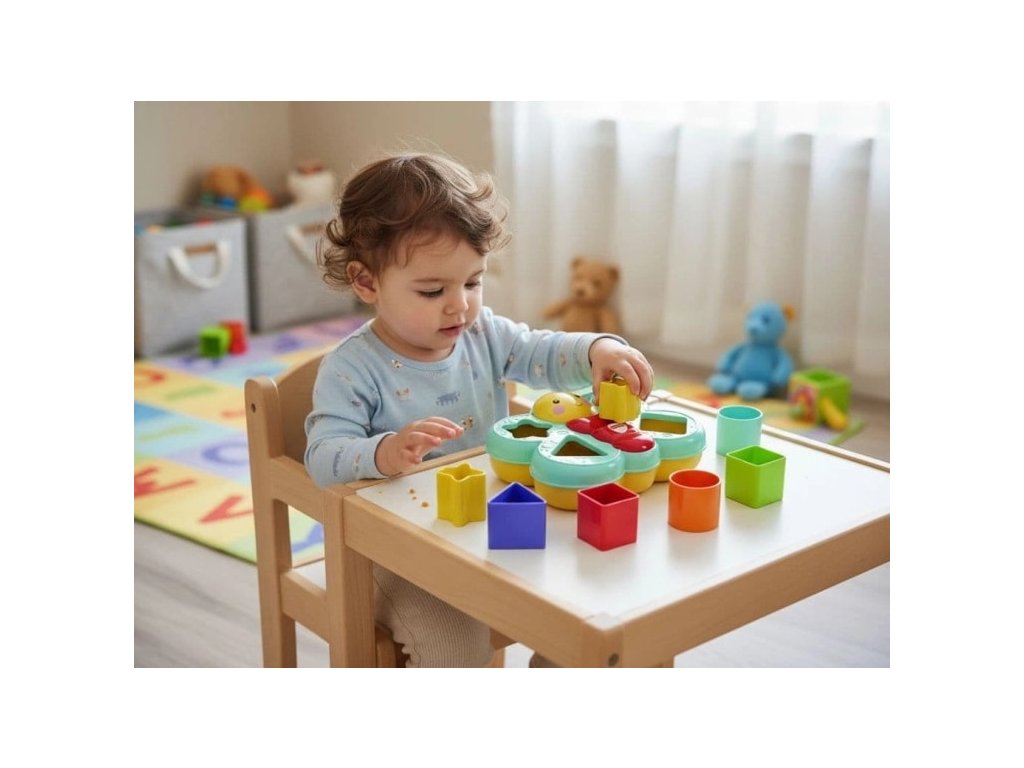 Tato hračka není jen o zábavě – je to malá učebna plná barev, tvarů a příležitostí k rozvoji. Manipulace s tvary zlepšuje jemnou motoriku a koordinaci rukou, hledání správných otvorů rozvíjí prostorovou představivost a logické myšlení. Pestré barvy a různorodé tvary učí dítě rozlišovat a pojmenovávat, zatímco postupné zvládání úkolů buduje trpělivost, vytrvalost a sebedůvěru.