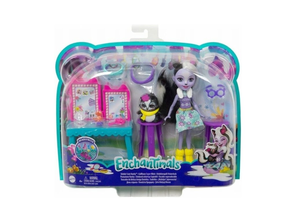 Hrací sada Enchantimals kosmetický stolek s panenkou a zvířátkem. Přátelé se mohou společně zkrášlovat a relaxovat díky toaletnímu stolku se dvěma stoličkami a dvojitým zrcadlem. Sada obsahuje více než 10 doplňků, jako jsou pásky, doplňky do vlasů, panenku a zvířátko.