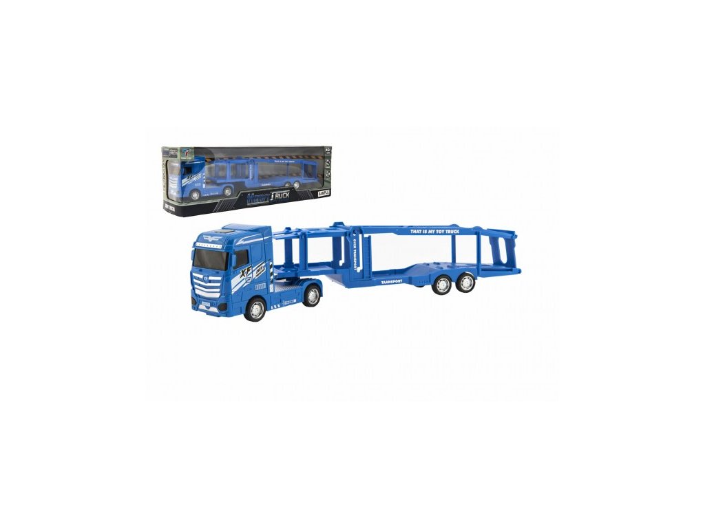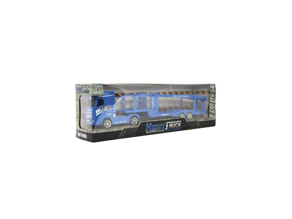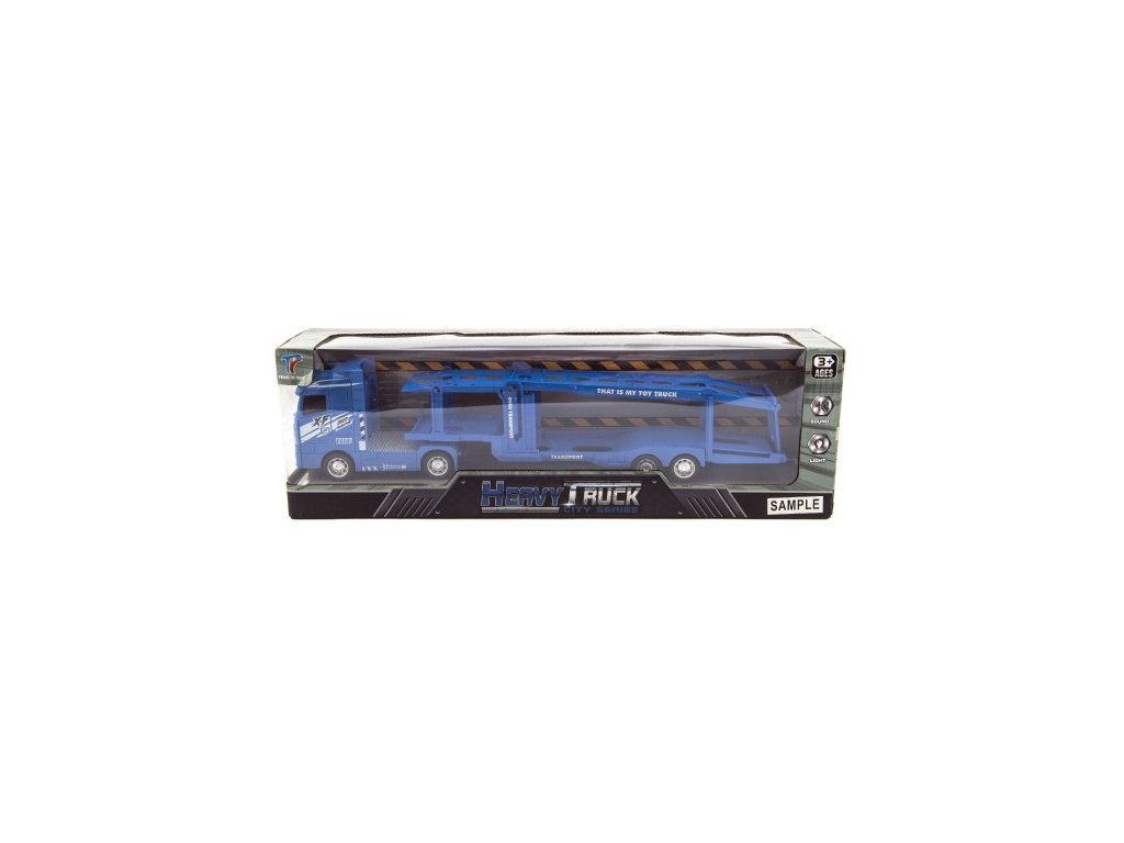 Kamion s návěsem pro přepravu aut je vyroben z kvalitního plastu. Délka soupravy je 35 cm. Kamion jezdí na setrvačník, svítí a vydává zvuky.