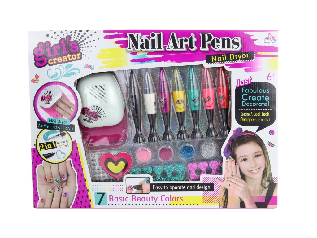 Vytvořte ze svých nehtů pravá umělecká díla s kreativní sadou na nehty! Tato zábavná sada je ideální pro malé parádnice, které chtějí rozvíjet svou kreativitu a styl. Sada nabízí vše, co je potřeba pro dokonalou manikúru – od barevných laků, po třpytky a nálepky.Sada obsahuje 7 oboustranných laků na nehty, které mají z jedné strany štěteček pro klasické lakování a z druhé strany zdobicí pero pro detailní designy. Díky tomu si děti mohou na nehtech vytvářet různé vzory a originální motivy. Sušička na nehty zajistí, že lak rychle zaschne a bude připraven na další krok – zdobení. K dispozici jsou také třpytivé prášky a barevné nálepky, které dodají nehtům extra lesk a kouzlo.