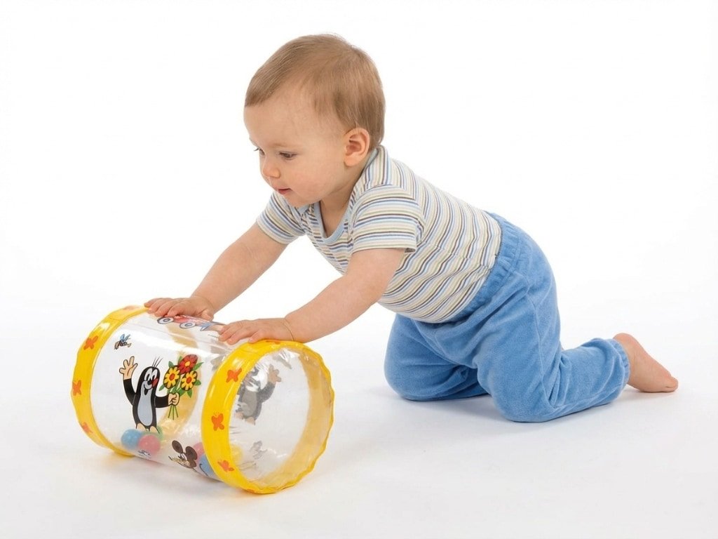 Krtkův válec s rolničkou je skvělá hračka pro děti od 6 měsíců, které se začínají otáčet, zvedat a posilovat tělíčko. Díky délce cca 40 cm a pevnému provedení slouží jako opora při zvedání a přetáčení, zatímco veselý motiv Krtečka a zvuk rolničky uvnitř miminko motivují k dalšímu pohybu. Kombinuje tak zábavu, rozvoj motoriky a smyslové vnímání – dítě se při hře baví a zároveň přirozeně trénuje koordinaci, rovnováhu a sílu svalů.