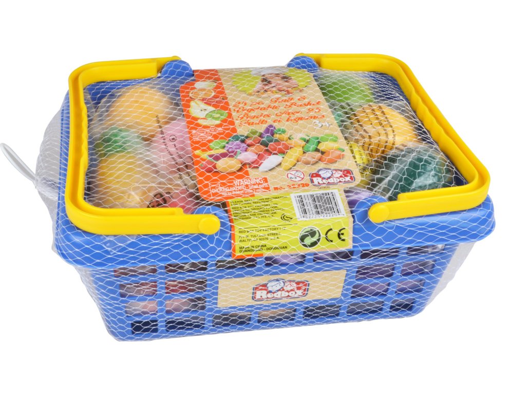 Nákupní košík o rozměrech 28 x 13 x 22 cm s 25 kusy plastových napodobenin ovoce a zeleniny je vhodný pro malé obchodníky od 3 let.