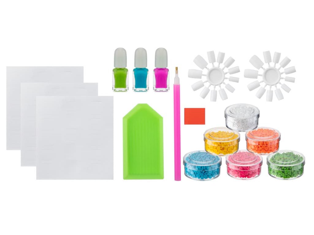 Obsah balení: 3 laky na nehty (různé barvy), 6 různobarevných nalepovacích kamínků, plastové nehty, nanášecí štětec