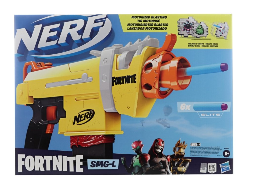 Motorizovaný vrhač SMG-L, inspirovaný těmi, které používají ve Fortnite, zachycuje vzhled toho z oblíbené videohry, od barevného provedení až po hroty, železný zaměřovač a mnoho dalších detailů. Obsahuje 3 volně stojící terče zdobené spreji z videohry. Sada obsahuje 6 šipek ELITE. Napájení 4x1,5V AA bateriemi (nejsou součástí balení). Doporučený věk 8+