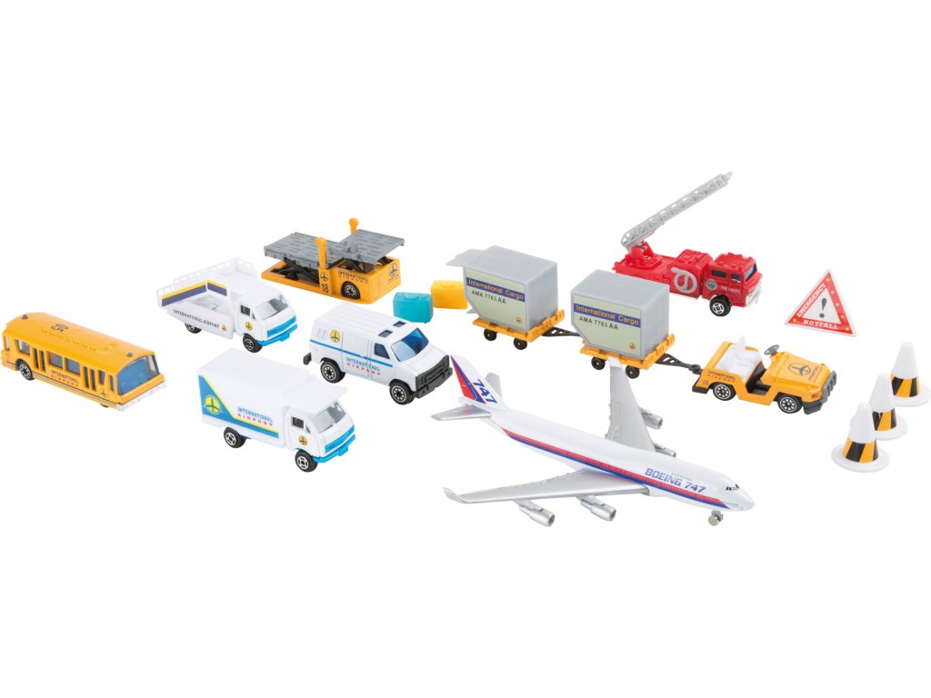 V této sadě kovových modelů najdete různá auta a jiné stroje, které jsou potřeba k provozu letiště. K dispozici máte model letadla Boeing 747, hasičské auto, shuttle bus, vozidlo pro přepravu zavazadel k letadlu a jiné stroje, včetně drobných doplňků.