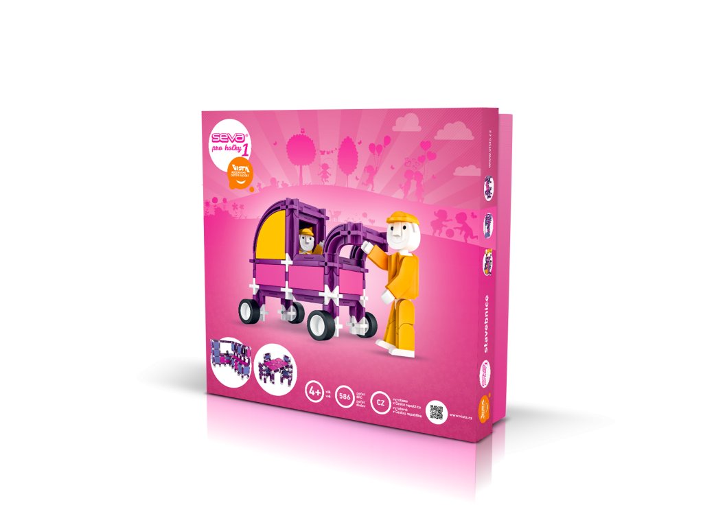 Stavebnice obsahuje celkem 586 dílků. Fialové spojovací díly ve třech délkách doplňují čtvercové a obdélníkové desky v reflexní růžové a lila barvě. Křížové spojky byly ponechány bílé.Stavebnici rozzáří nejen žlutý (velký a malý) seváček, ale výplně na boudičku kočárku.Ve stavebnici najdete také 8 koleček tvořených bílými disky a černými pneumatikami a dále fialové obloukové spojovací díly ve dvou velikostech, aby bylo možné kočárek sestavit. Stavebnice je určena zejména ke stavění nábytku pro sevačky.
