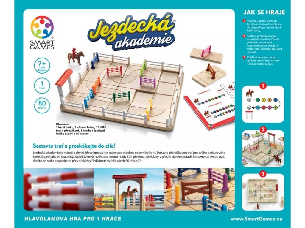 Milujete koně a rádi řešíte hlavolamy? SMART – Jezdecká akademie je ideální hra pro všechny, kteří chtějí procvičit mozek a zároveň si užít zábavu s parkurovými skoky! S touto chytrou hrou se stanete trenérem svého vlastního koně – vaším úkolem je sestavit správnou překážkovou trať tak, aby váš kůň všechny překážky zdolal v přesně daném pořadí, stejně jako na skutečných závodech.