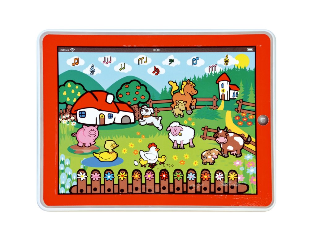 Tablet učí děti poznávat zvířata z farmy a jejich zvuky, což zábavnou formou rozvíjí jejich znalosti.