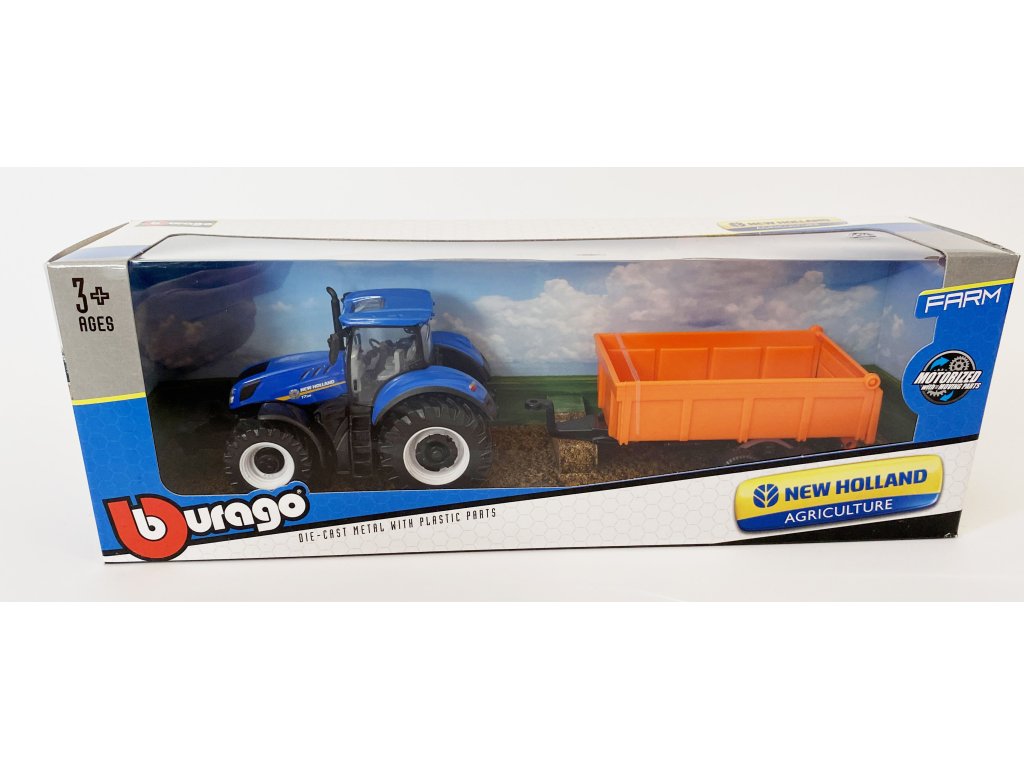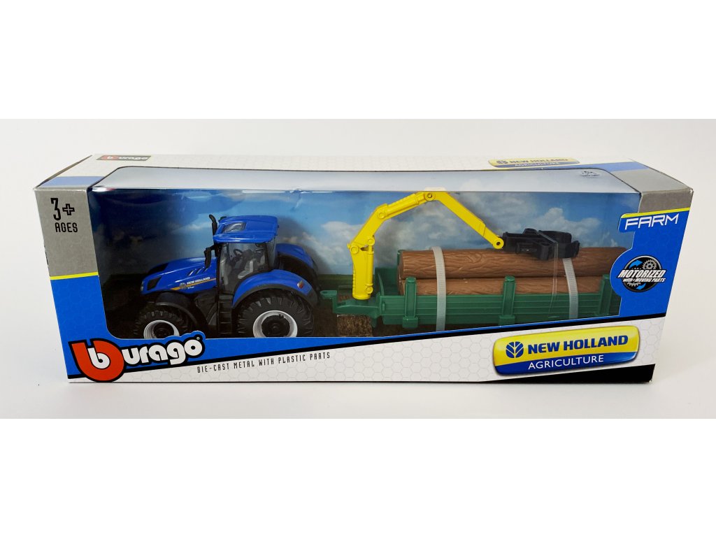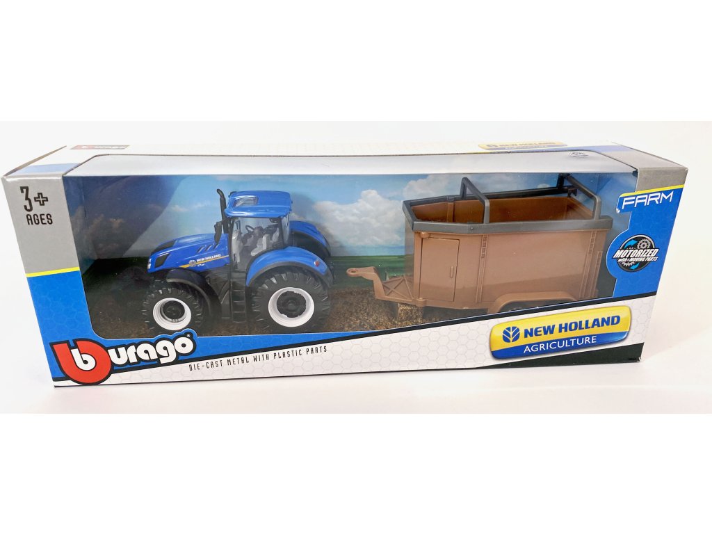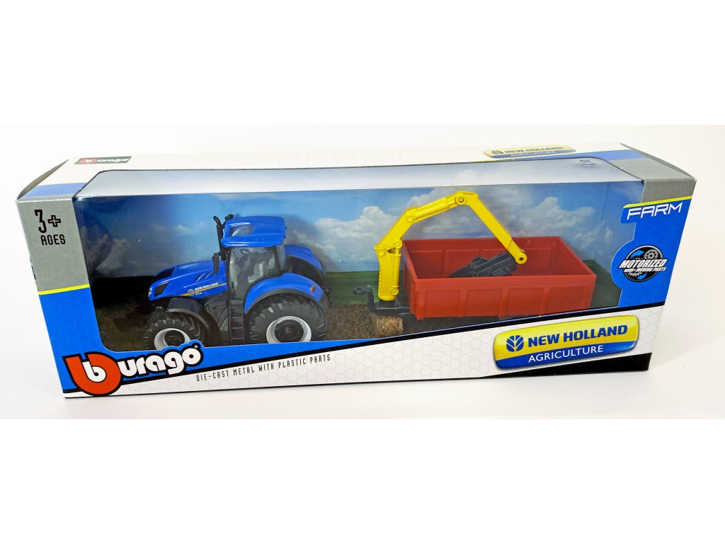 Model traktoru New Holland s různými variantami vleku od firmy Bburago. Traktor má odnímatelnou kabinu, vlek lze odpojit.