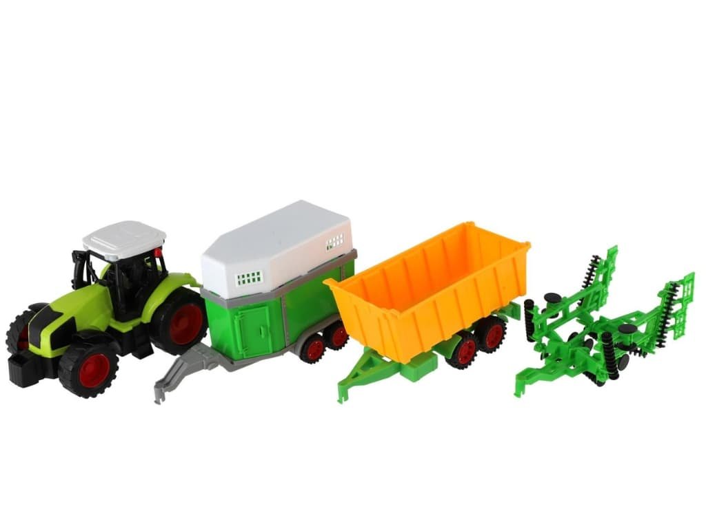 Sada zahrnuje tři nepostradatelné přívěsy: sklápěcí oranžový vůz pro přepravu úrody, zelený přepravník s bílou střechou pro pohodlnou jízdu zvířátek, a diskový podmítač pro přípravu polí. Každý přívěs nabízí unikátní herní možnosti a podporuje rozvoj kreativity.