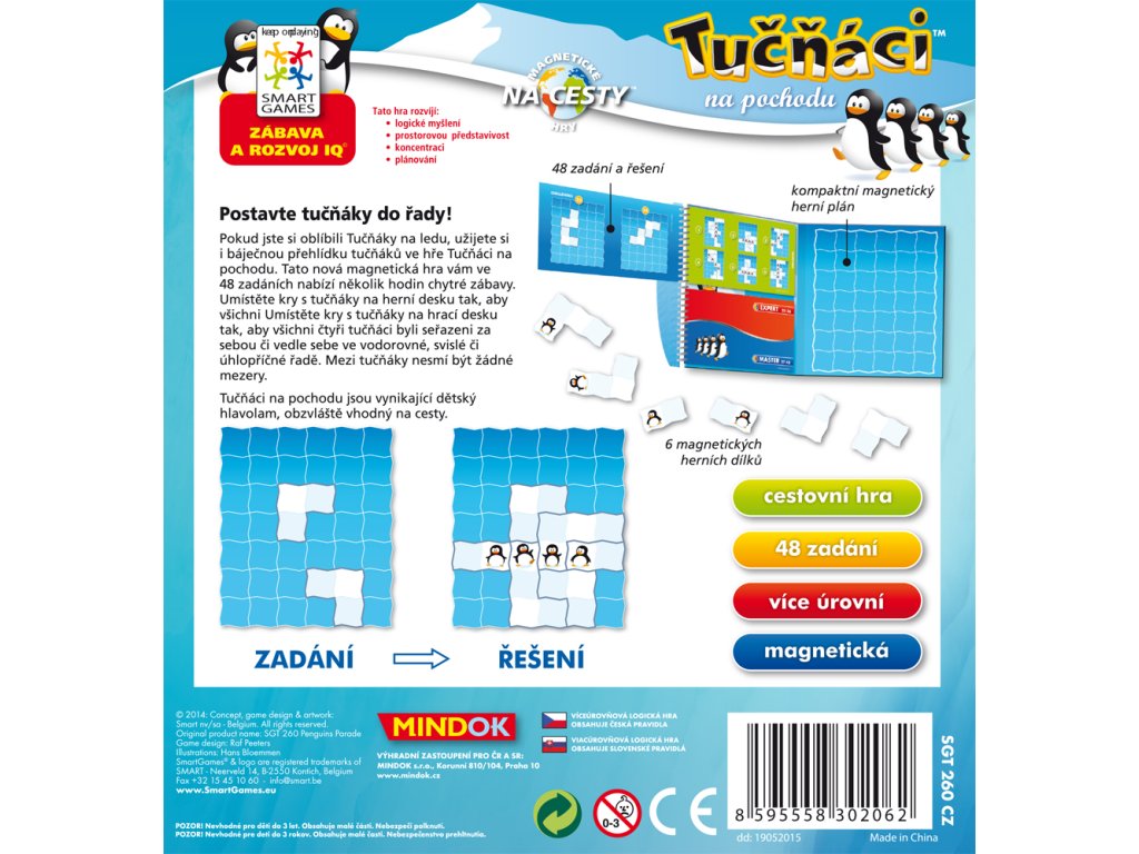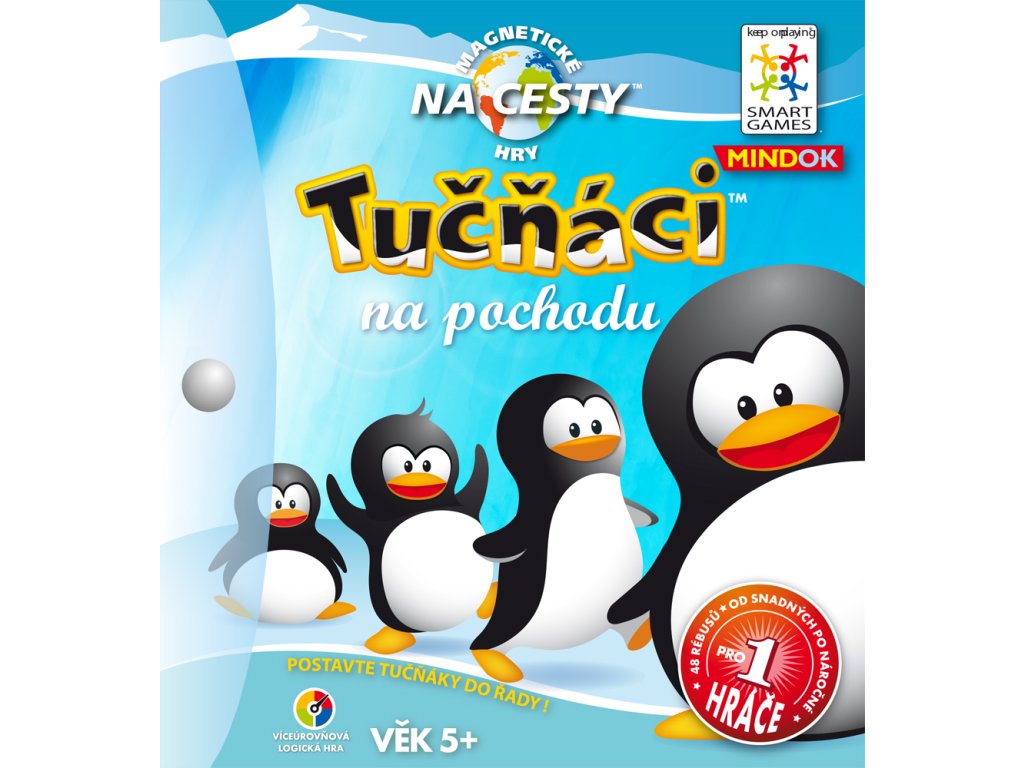 Postavte tučňáky do řady! Pokud jste si oblíbili Tučňáky na ledu, užijete si i báječnou přehlídku tučňáků ve hře Tučňáci na pochodu. Tato nová magnetická hra vám ve 48 zadáních nabízí několik hodin chytré zábavy. Umístěte kry s tučňáky na herní desku tak, aby všichni 4 tučňáci byli seřazeni za sebou či vedle sebe ve vodorovné, svislé či úhlopříčné řadě, a to tak, aby mezi tučňáky nebyly zbytečné mezery. Tučňáci na pochodu jsou vynikající dětstký hlavolam, obvzláště vhodný na cesty