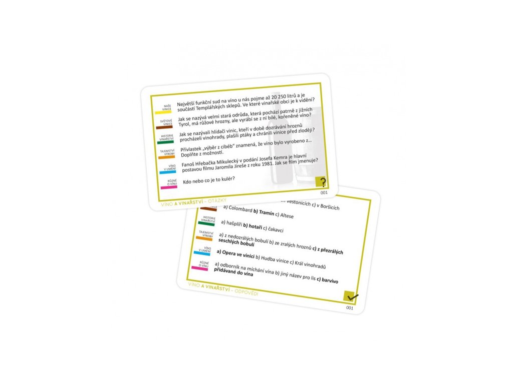 Poutavé zábavné karetní kvízy na cesty nebo perfektní rozšíření základní verze hry Česko - Otázky a odpovědi. V každém balíčku Kvízů do kapsy najdete 50 karet s otázkami rozdělenými do šesti tematických okruhů. Ke každé z 300 otázek máte k dispozici na výběr ze tří možných odpovědí.